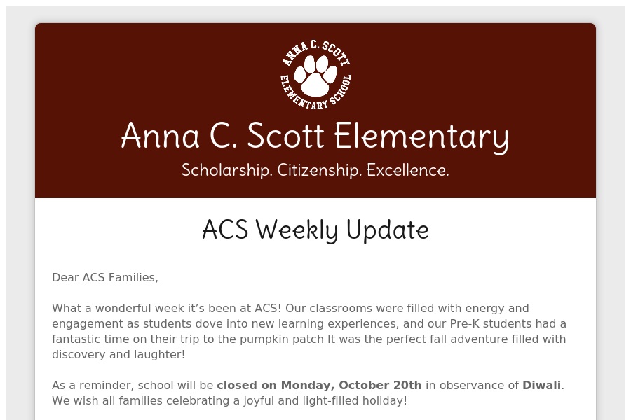 Anna C. Scott Elementary Scholarship. Citizenship. Excellence. ACS Weekly Update Dear ACS Families, What a wonderful week its been at ACS! Our classrooms were filled wi. . .